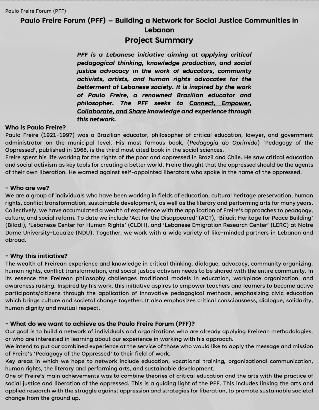 PFF is a Lebanese initiative aiming at applying critical pedagogical thinking, knowledge production, and social justice advocacy in the work of educators, community activists, artists, and human rights advocates for the betterment of Lebanese society. It is inspired by the work of Paulo Freire, a renowned Brazilian educator and philosopher. The PFF seeks to Connect, Empower, Collaborate, and Share knowledge and experience through this network.
